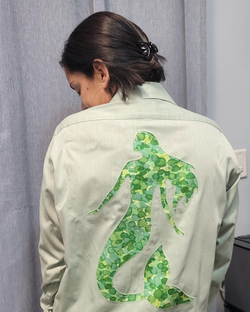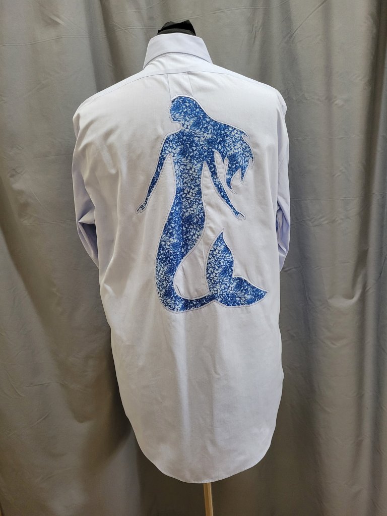 Starting with a thrifted dress shirt, a design is added via reverse applique.